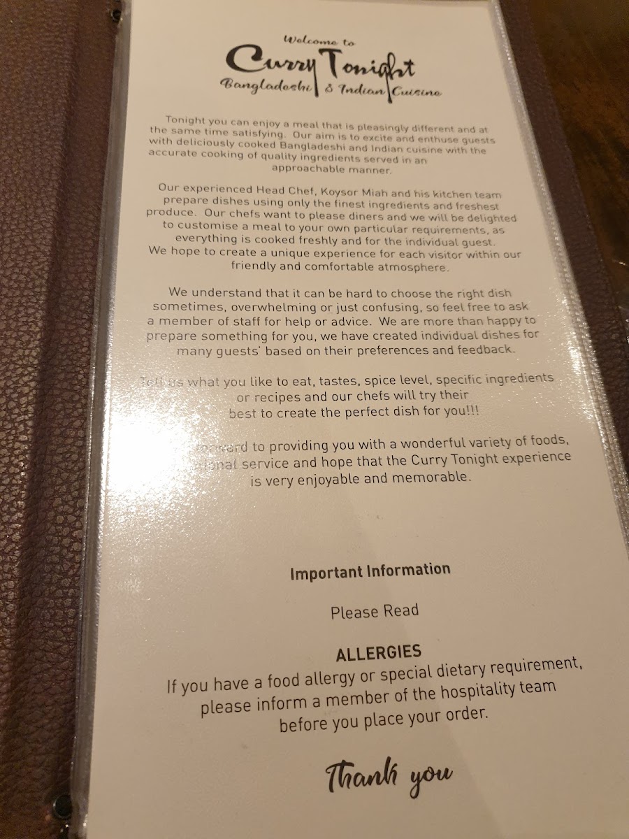 - Drinks: Kingfisher Indian Lager, Sambuca.